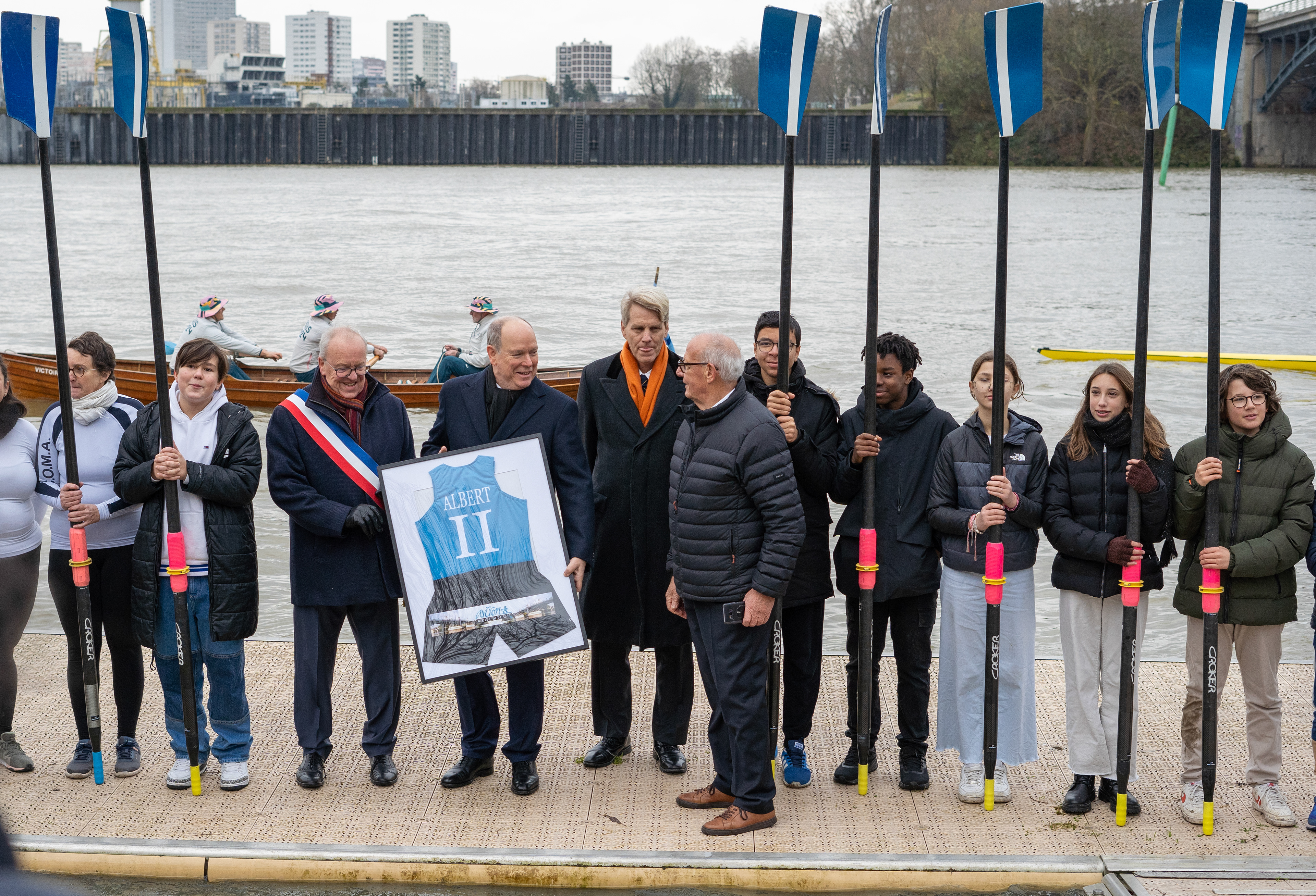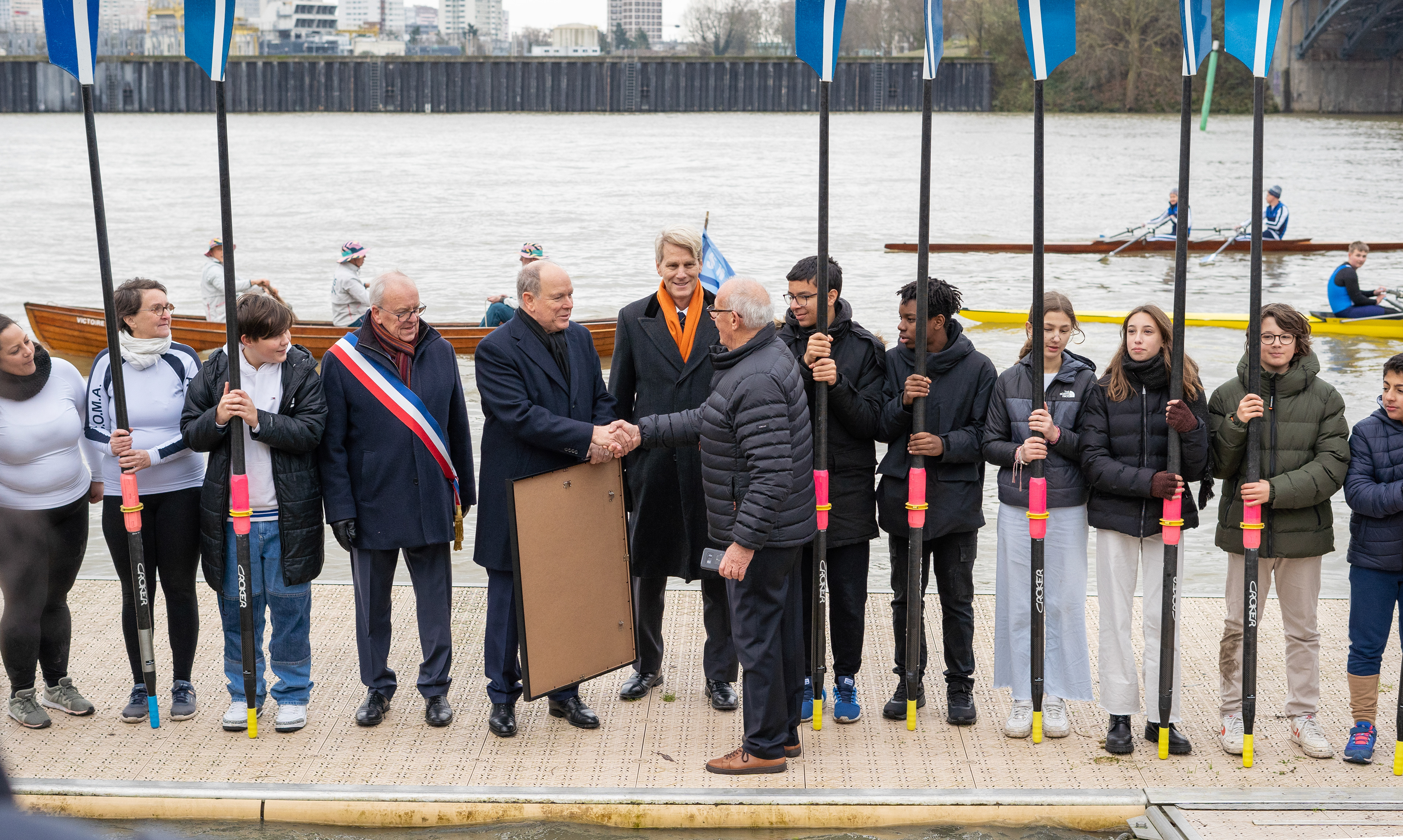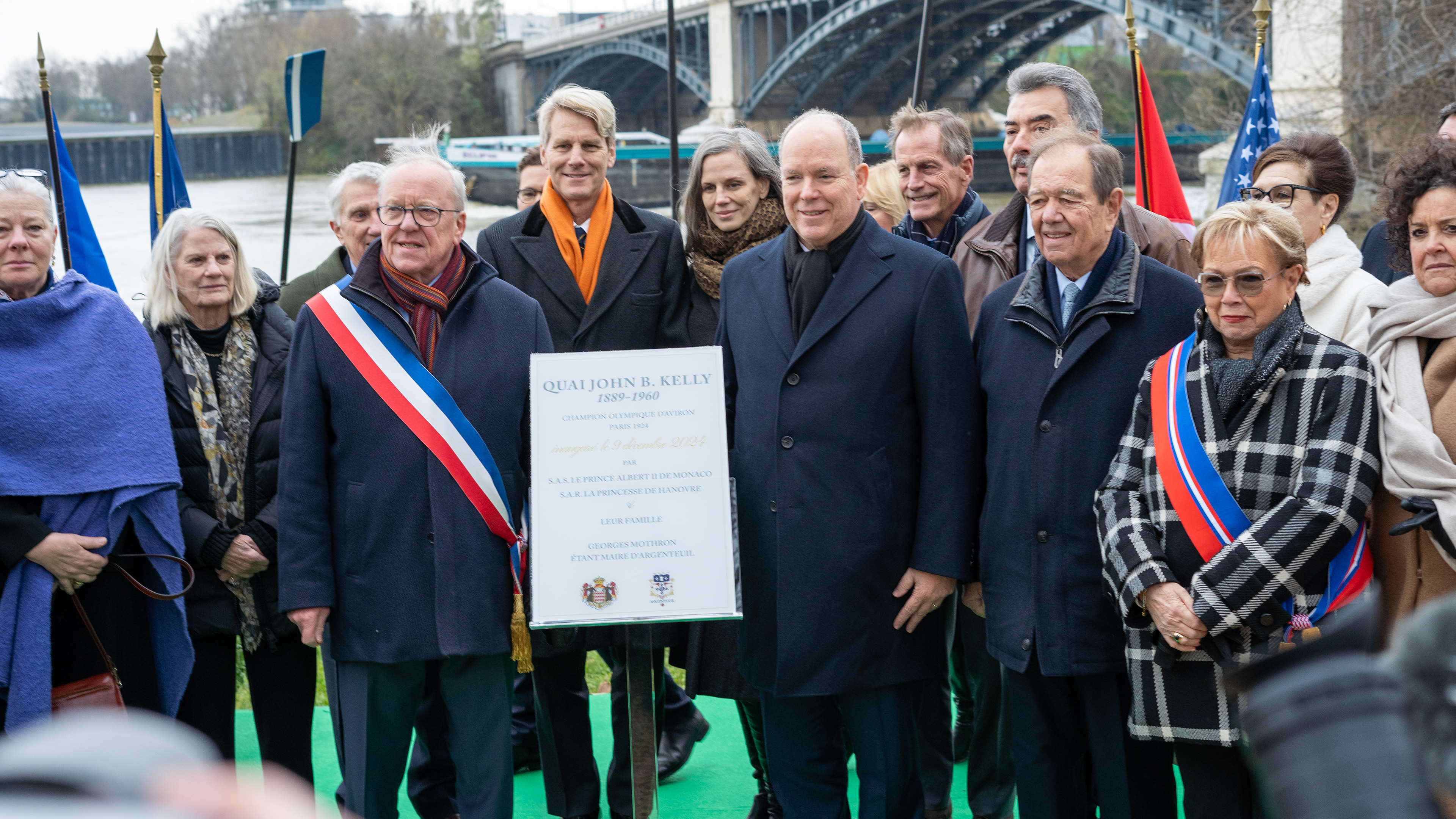 Lundi 9 décembre 2024, S.A.S le Prince Albert II de Monaco a inauguré, lors d’une cérémonie officielle, une fresque monumentale dédiée à John B Kelly*, son grand-père et son cousin Paul Costello, médaillés d’aviron en double aux Jeux Olympiques de Paris 1924 sur le bassin d’Argenteuil. Le club d'aviron d'Argenteuil a donc accueilli à cette occasion S.A.S le Prince Albert II de Monaco.